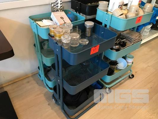2 x COLOURED METAL 3 TIER STANDS & ASSORTED GLASSWARE