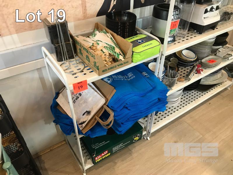 WHITE METAL 3 TIER SHELF, SUNDRIES & BAGS