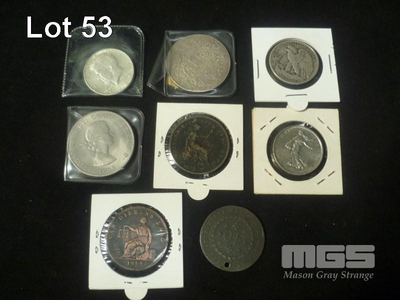 ASSORTED FORIGN COINS INC 2 X US HALF DOLLARS 1944 & 1964, POLISH 10 ZLOTY SILVER COIN 1933 1855 NEW TOWN TOLL GATEVAN DIEMENS LAND, 1857 BRITISH PENNY 1894 COPPER COIN WITH PENDANT HOLE, CHURCHILL CROWN, 1963 5 FRANC COIN