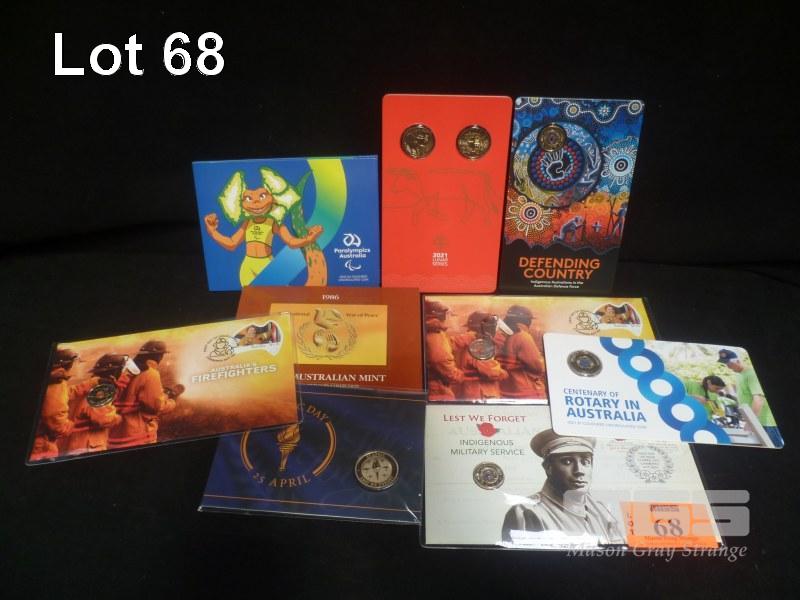9 X COMMEMORATIVE COIN PACKS ROTARY IN AUSTRALIA, DEFENDING COUNTRY, LEST WE FORGET, INTERNATIONAL YEAR OF PEACE 2021 LUNAR SERIES, 2 X AUSTRALIA'S FIREFIGHTERS, PARAOLYMPICS, ANZAC DAY