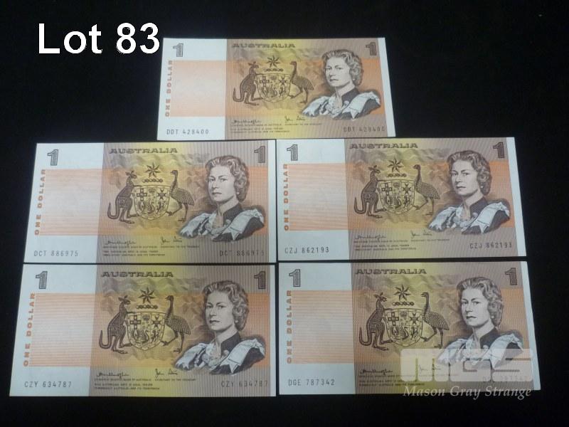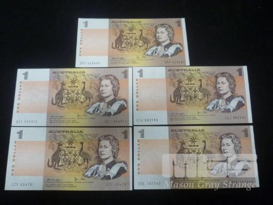 1977 5 x 1 DOLLAR NOTES MIXED PREFIXES KNIGHTS STONE UNC