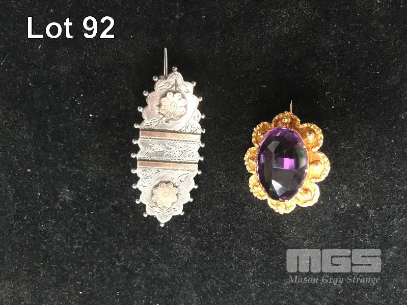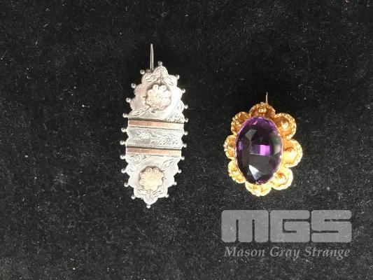 STERLING SILVER, ROSE GOLD ETCHED BROOCH, 4.31gm, AMETHYST BROOCH IN GOLD PLATE FLORAL SETTING (IMPERFECTIONS TO AMETHYST)