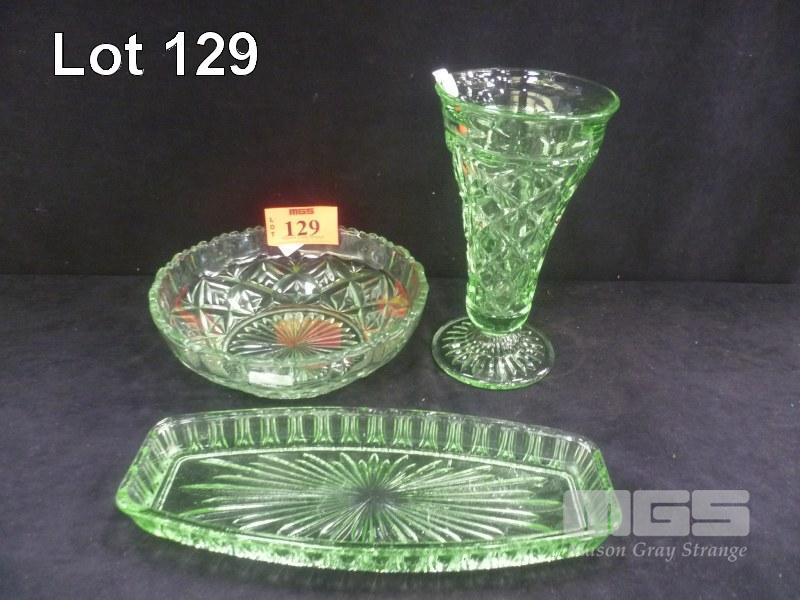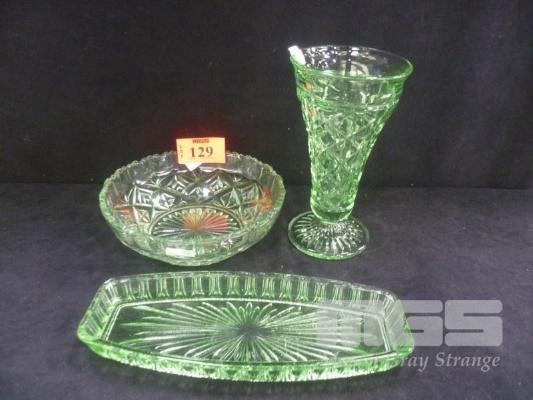 URANIUM GLASS VASE WITH BOWL & GREEN DEPRESSION GLASS SANDWICH TRAY