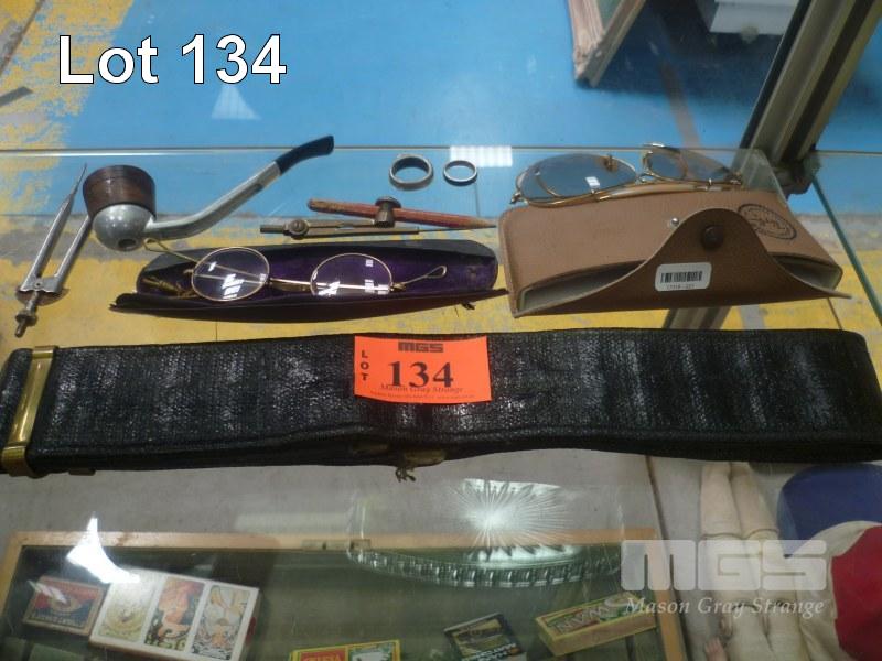 ASSORTED CURIOS INC MILITARY BELT, TOBACCO PIPE, COMPASSES, GLASSES, ETC