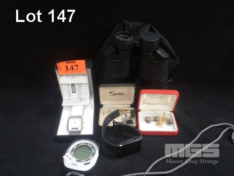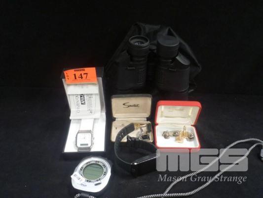 PAIR FIELD 5-7 BINOCULARS, CUFF LINKS, BADGES, ELECTRONIC COMPASS, CITIZEN WATCH FACE & ELECTRONIC WATCH