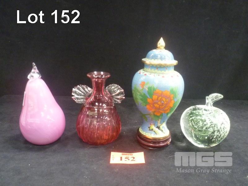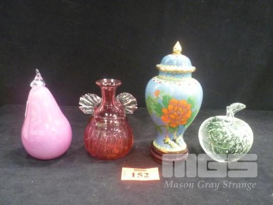 CLOISONNE LIDDED URN, 20cm (H), ART GLASS FRUIT & HAND MADE GLASS VASE