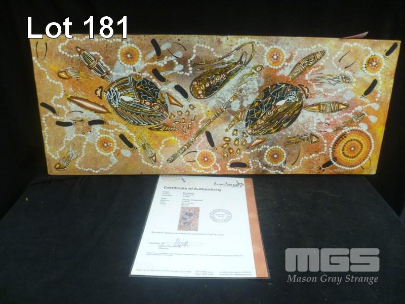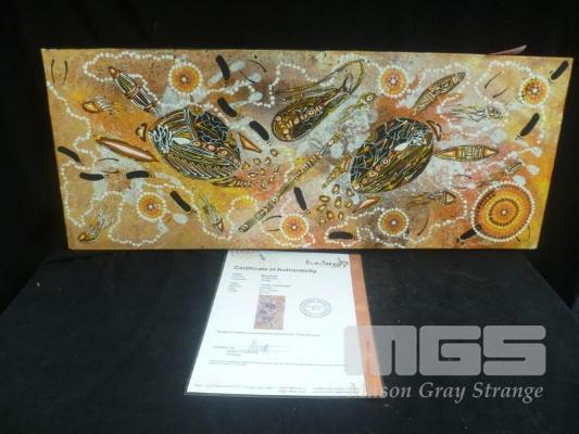 ACRYLIC ON CANVAS AUSTRALIAN INDIGENOUS PAIINTG, TURTLE DREAMING BY MUNDEJAH, WITH COA FROM BUNDARRA GALLEY, 30 x 101cm