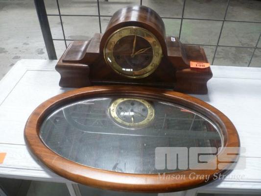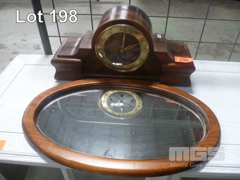 TIMBER ART DECO MANTLE CLOCK WITH KEY (REAR COVER MISSING) & OVAL, TIMBER FRAME WALL MIRROR