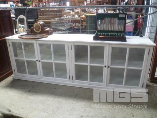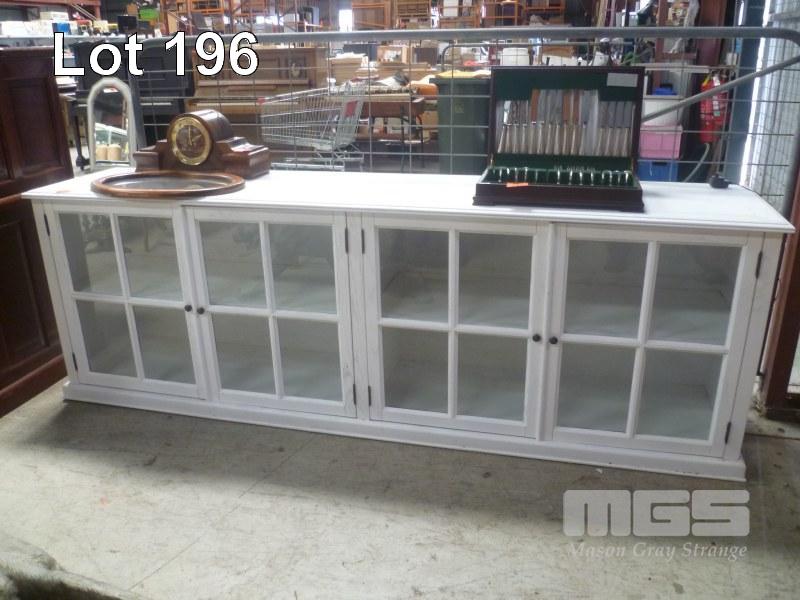 WHITE PAINTED TIMBER LOWLINE DISPLAY CABINET, 4 x GLAZED DOORS, 2 TIER, 2.4m (L), INTERNAL LIGHTING FITTED