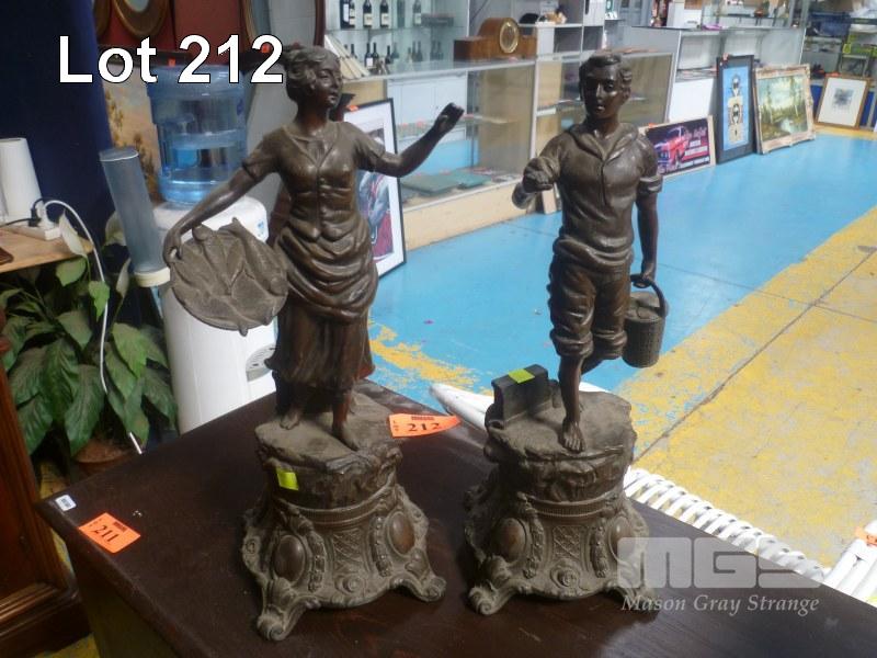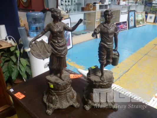 2 x SPELTER STATUES OF LADY WITH BASKET OF FISH & MAN WITH BASKET BREAD, 45cm (H)