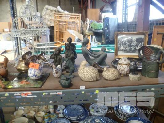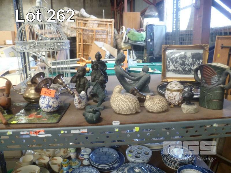 ASSORTED FIGURINES, ORNAMENTS, BIRD CAGE, ETC