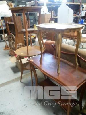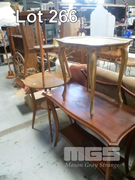 PAIR TIMBER LAMINATE TOPPED, ROUND OCCASIONAL TABLES, ART DECO TIMBER HALL TABLE & GOLD PAINTED SIDE TABLE