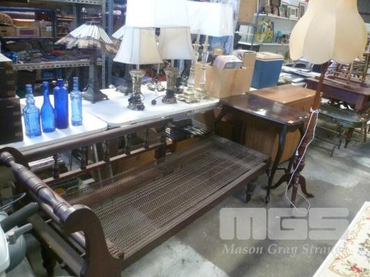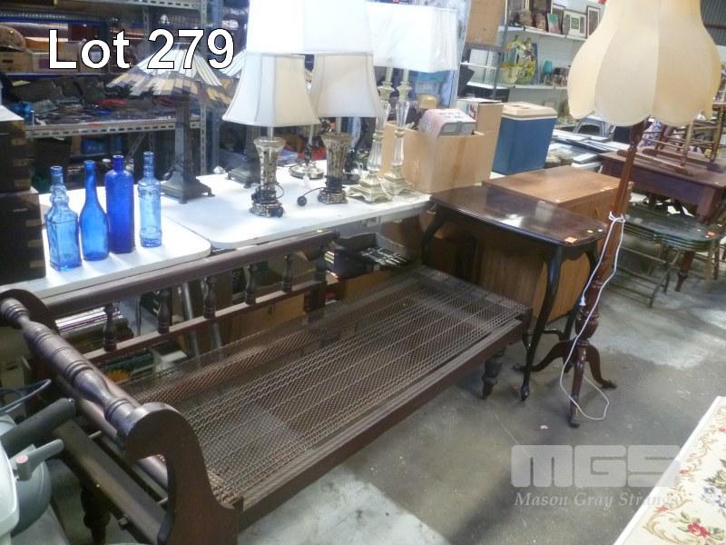VINTAGE DAY BED, (NO MATTRESS), ART DECO TIMBER STANDARD LAMP & OCCASIONAL TABLE
