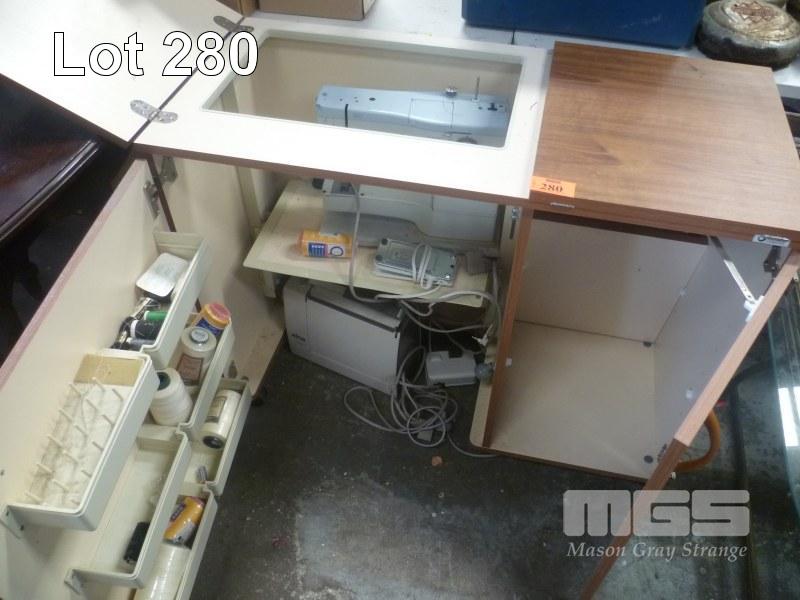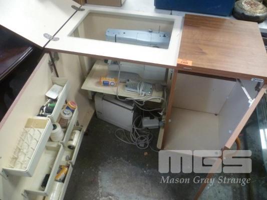 ELNA SEWING MACHINE IN HORN SEWING CABINET WITH ACCESSORIES