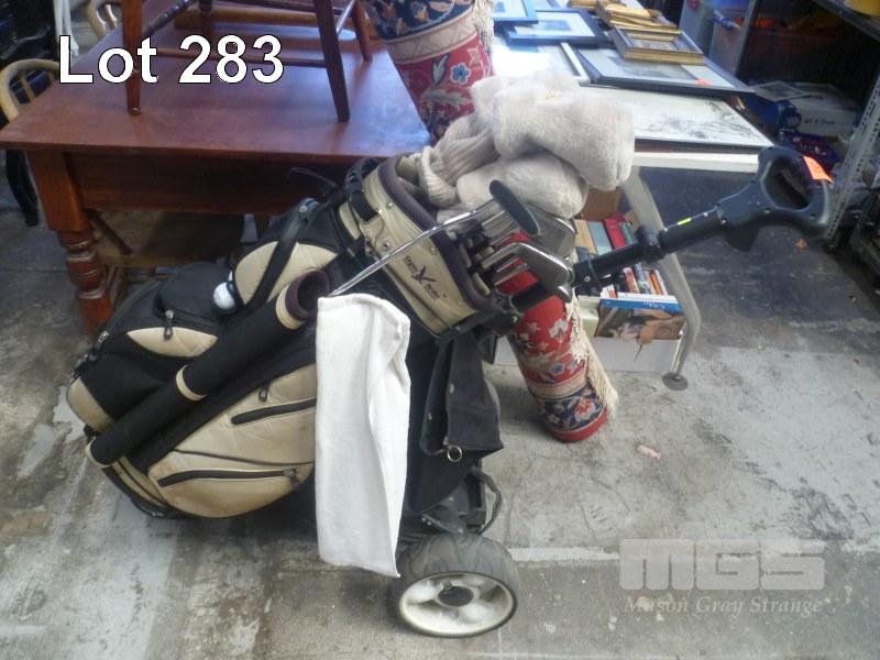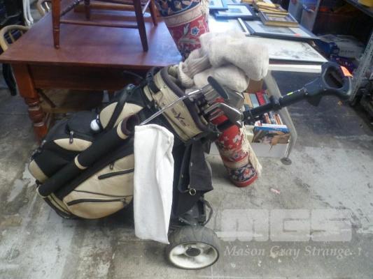 GOLF CLUBS IN BAG WITH ELECTRIC BUGGY
