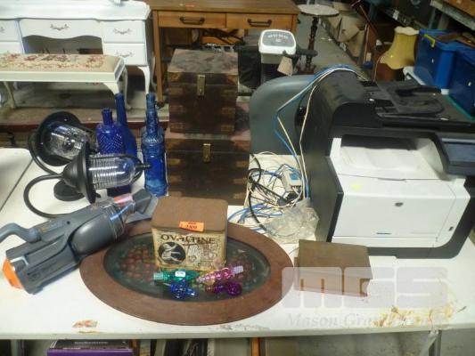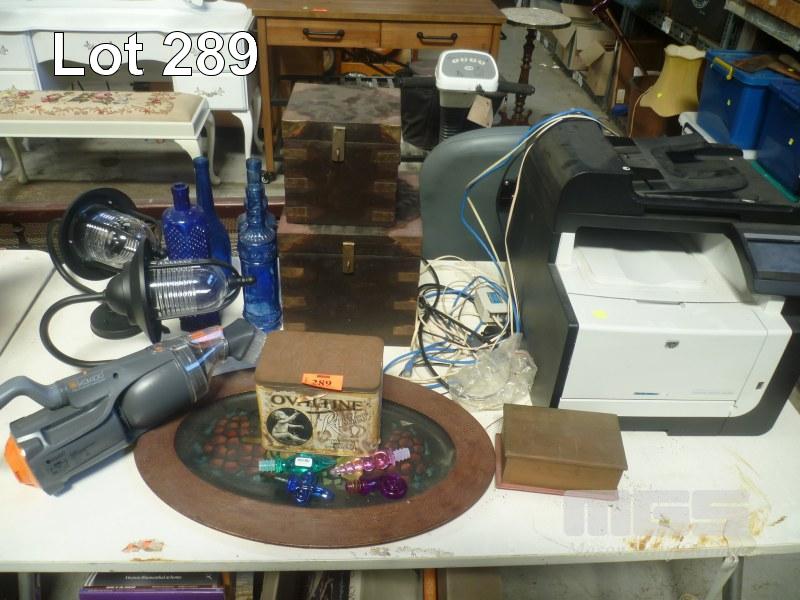 HP LASERJET PRO CM1415FNW COLOUR MFP, TIMBER BOXES, BLUE GLASS BOTTLES, ETC