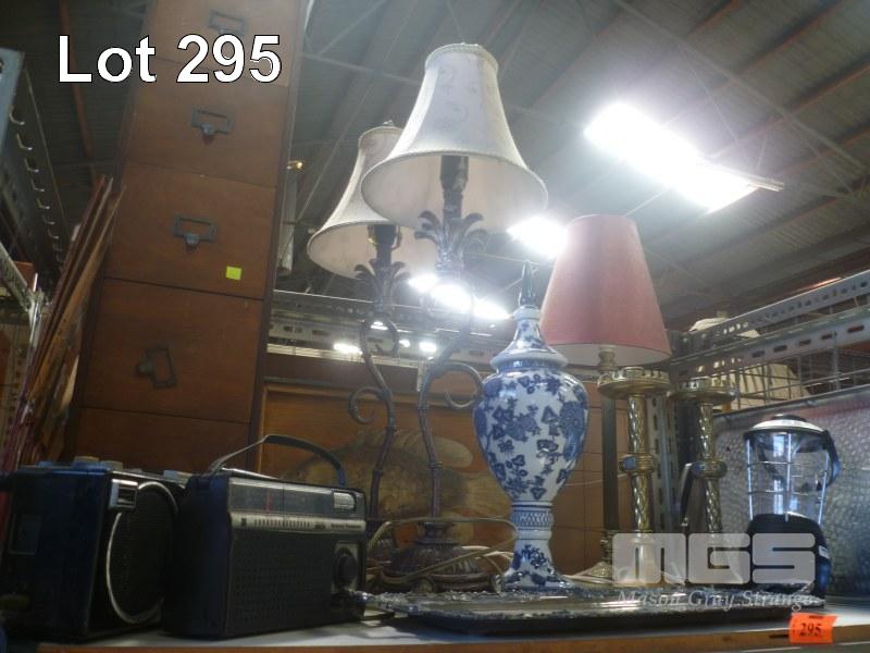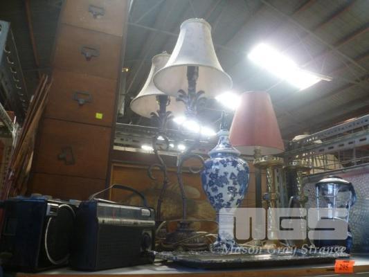 MID CENTURY CARD FILE DRAWER, TABLE LAMPS, WILLOW WARE, URN, RADIOS, ETC