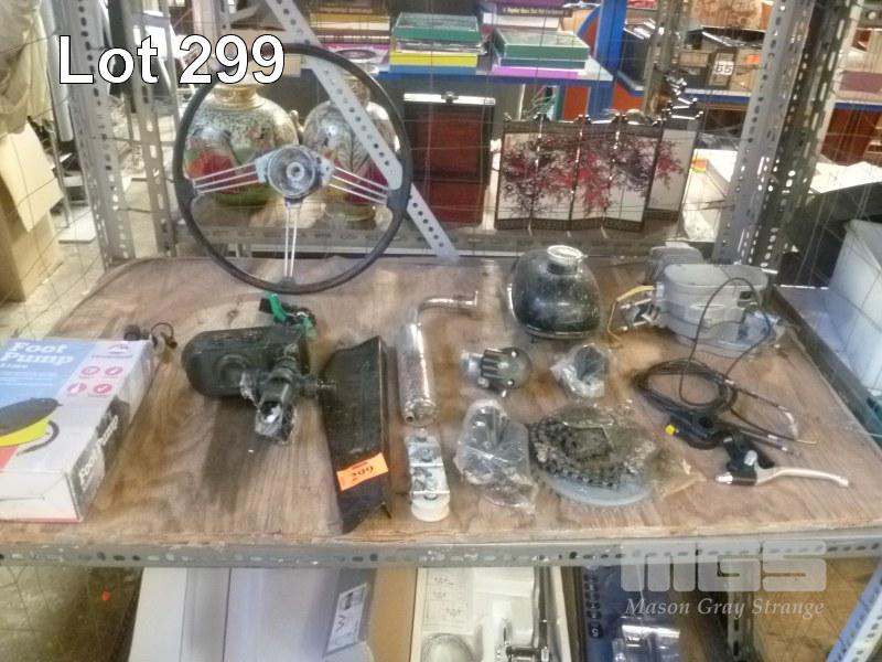 VINTAGE MINI MOTOR BIKE MOTOR AND PARTS, VINTAGE CAR STEERING WHEEL ETC