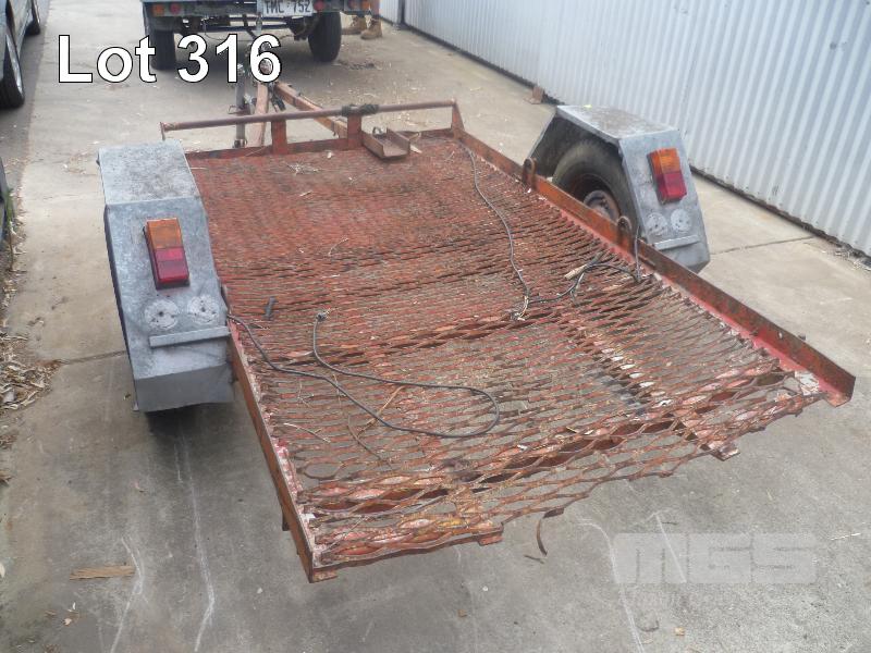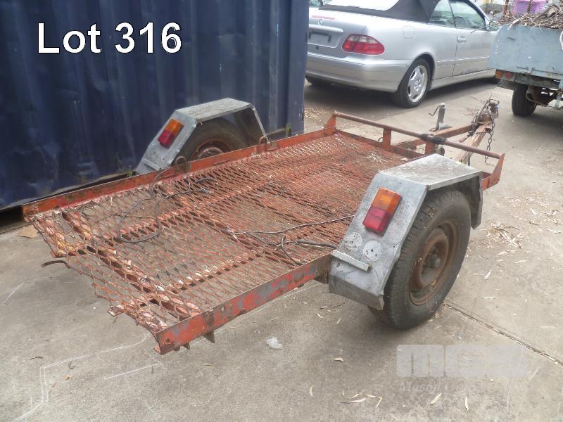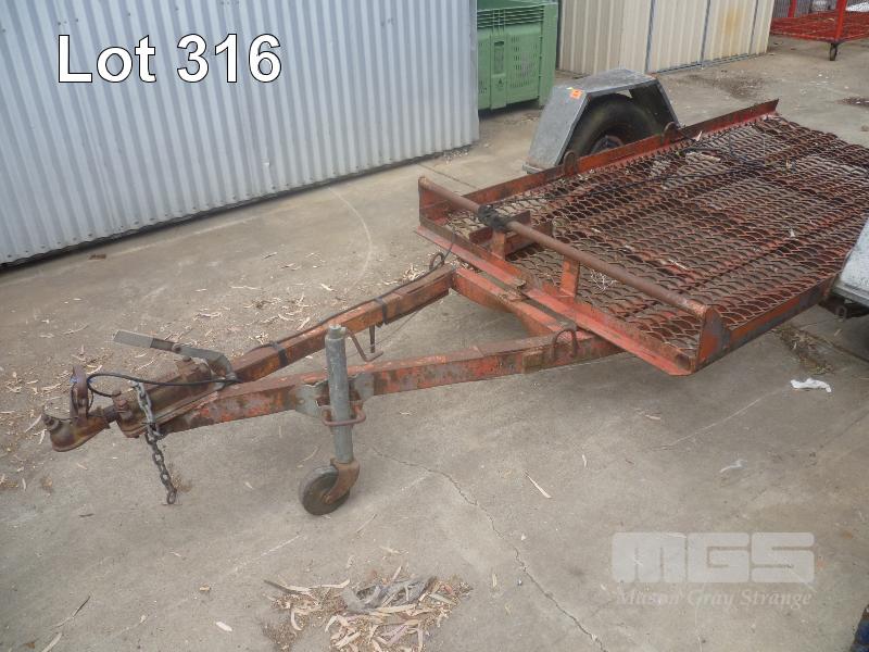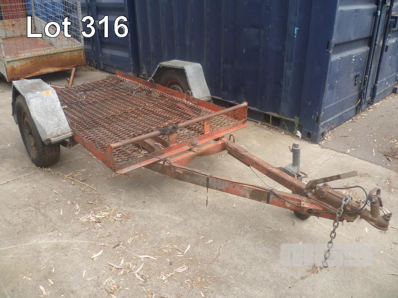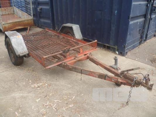 HOMEMADE PLANT TRAILER 7 X 5 SINGLE AXLE SINGLE AXLE, BALL HITCH, CABLE BRAKES, JOCKEY WHEEL, TILTING TRAY, TO SUIT RIDE ON LAWNMOWER, LIGHTS NEED TO BE REWIRED, RESTORATION PROJECT (NO PAPERS, NO OWNER'S MANUAL, NO SERVICE BOOKS)