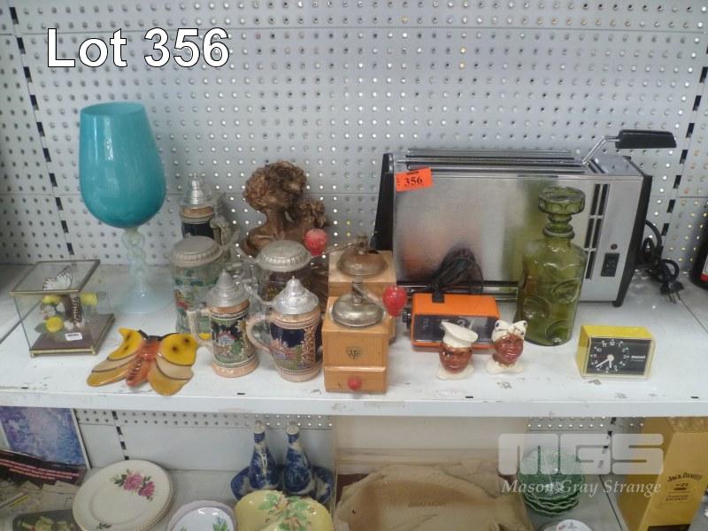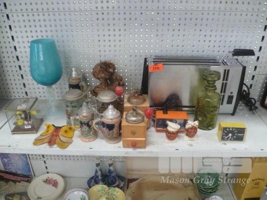 ASSORTED RETRO ITEMS INC VERTICAL GRILLER, COFFEE GRINDERS, MAMMY S&P, BLUE GLASS VASE, ALL FAULTS, BEER STEINS, ETC