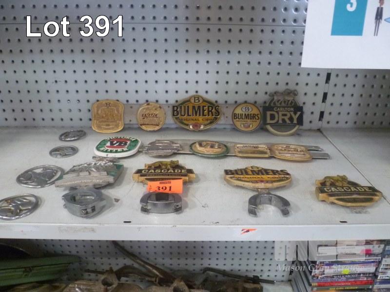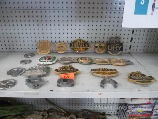 ASSORTED CAR BADGES & KEG TAP BADGES