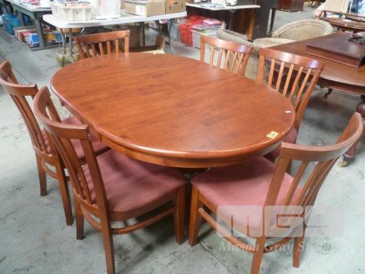 TIMBER 7 PIECE DINING SUITE INC OVAL EXTENSION TABLE, SINGLE LEAF, SINGLE PEDESTAL & 6 x DINING CHAIRS, PINK FABRIC, CURVED BACK