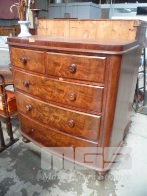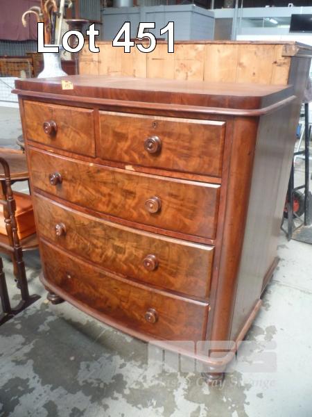 TIMBER VENEER 5 DRAWER CHEST, BUNG FEET, TIMBER KNOBS, (1 x MISSING)