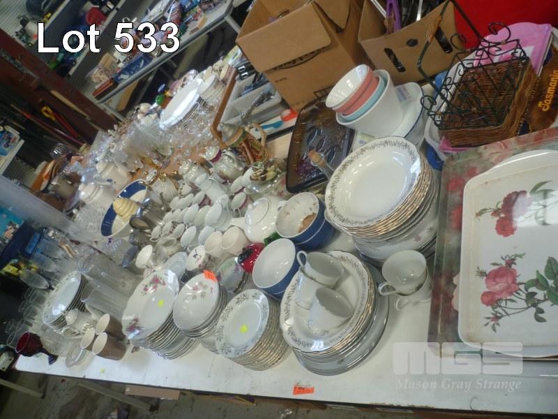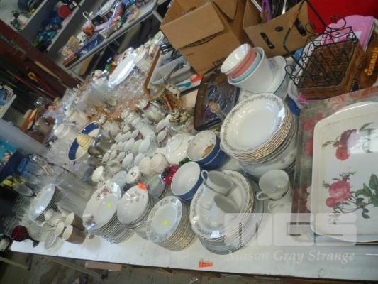 ASSORTED DINNERWARE, GLASSWARE, TEA POTS, ETC, 1 x TABLE