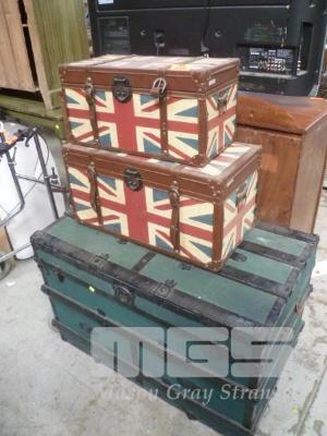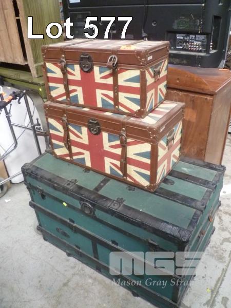 VINTAGE TRAVEL TRUNK, GREEN/BLACK & 2 x GRADUATING TRUNKS