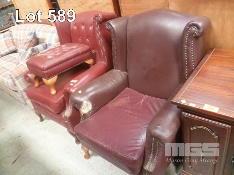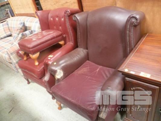 BURGUNDY LEATHER ARM CHAIR WITH MATCHING FOOT STOOL, WING BACK, DEEP BUTTON, ROLL ARM & BROWN LEATHER ARM CHAIR (TORN ON ARMS)