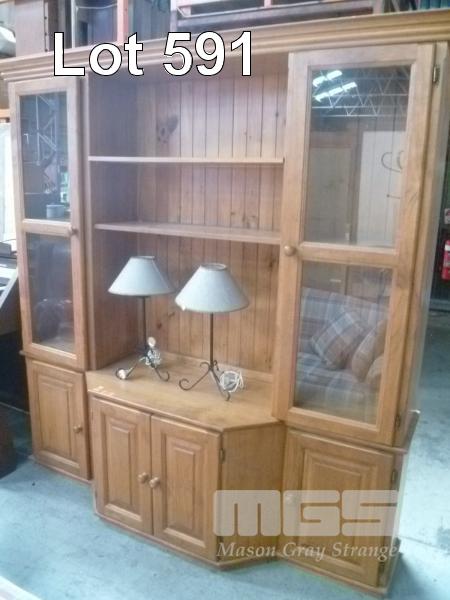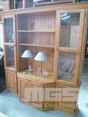 PINE 2 PIECE ENTERTAINMENT UNIT, GLAZED DOORS, 4 DOOR UNDERSTORAGE & PAIR TABLE LAMPS