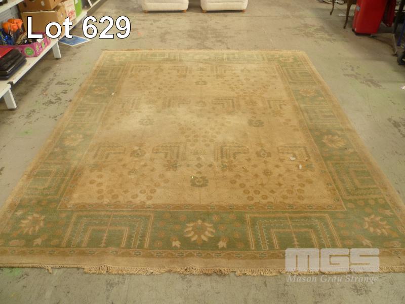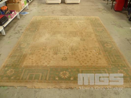 GREEN/BEIGE WOOL FLOOR RUG, 305 x 246cm (FADED)