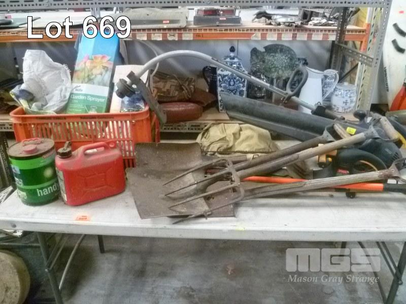 RYOBI HEDGE TRIMMER, GMC LEAF BLOWER, BLACK & DECKER WHIPPER SNIPPER, GARDEN SPRAYERS, FUEL TINS & SHOVELS