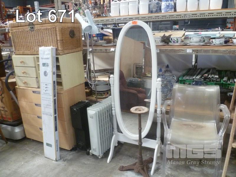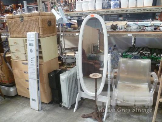 BEECHWOOD 4 DRAWER CHEST, WICKER BASKET, 2 x COLUMN HEATERS, STANDARD LAMP, WHITE PAINTED CHEVAL MIRROR & PAIR CLEAR PLASTIC OUTDOOR ARMCHAIRS, ETC