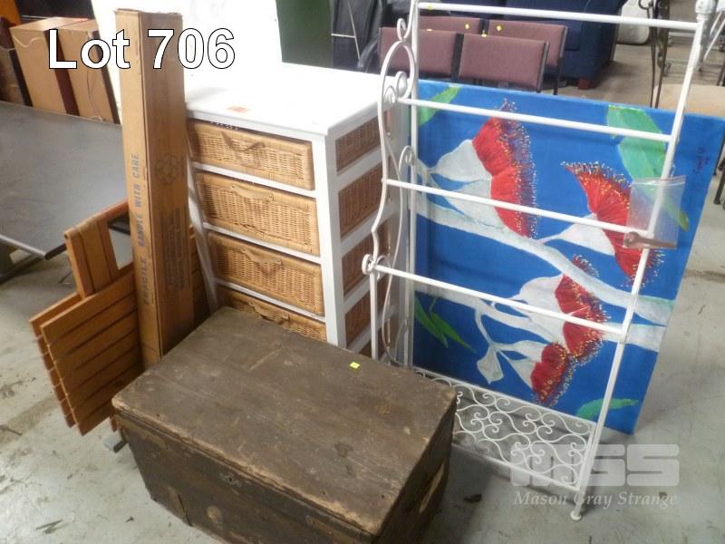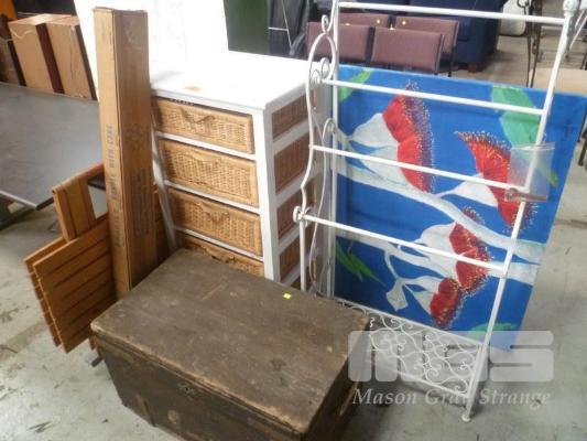 DRAWER UNIT WITH WICKER DRAWERS, METAL TOWEL RACK, TIMBER TRUCK, FOLD UP TABLE, MOVIE SCREEN & PAINTING
