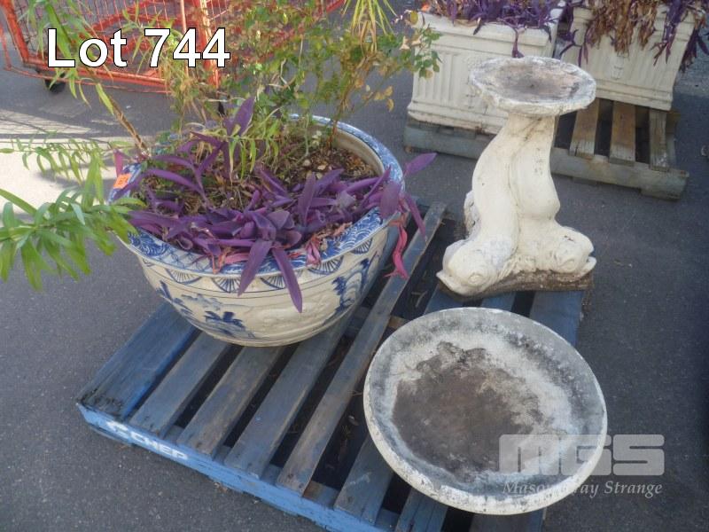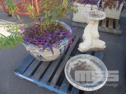 LARGE GLAZED GARDEN POT WITH PLANTS & CONCRET 2 PIECE BIRD BATH