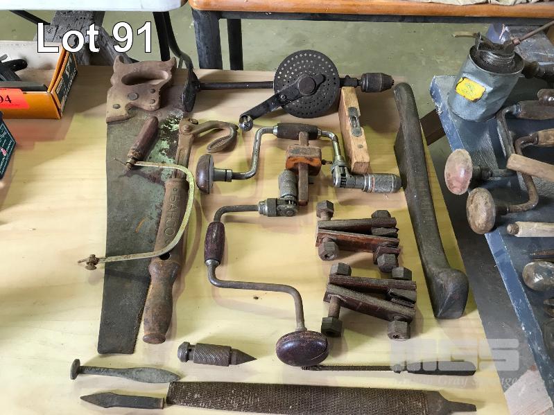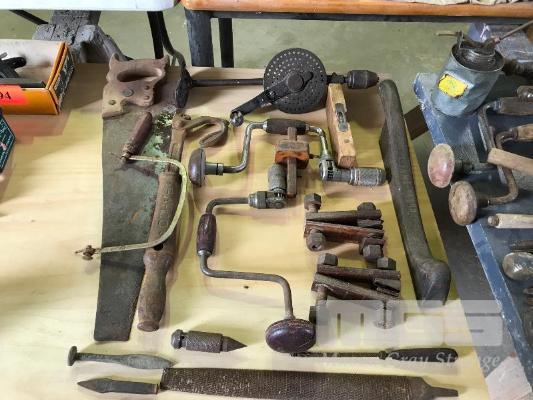 ASSORTED VINTAGE WOODWORKING TOOLS, DRILLS, SAW, BAHCO NAIL REMOVER, CLAMPS