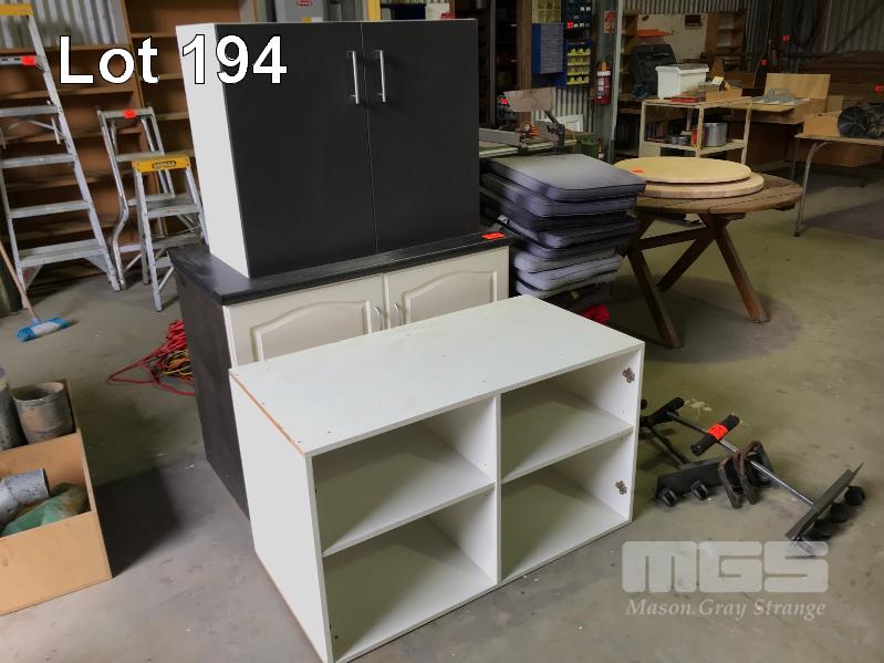 PACKING BLANKETS & 6 x OUTDOOR CHAIR CUSHIONS, 2 x LAMINATE CABINETS & SHELF