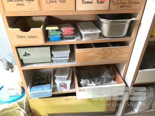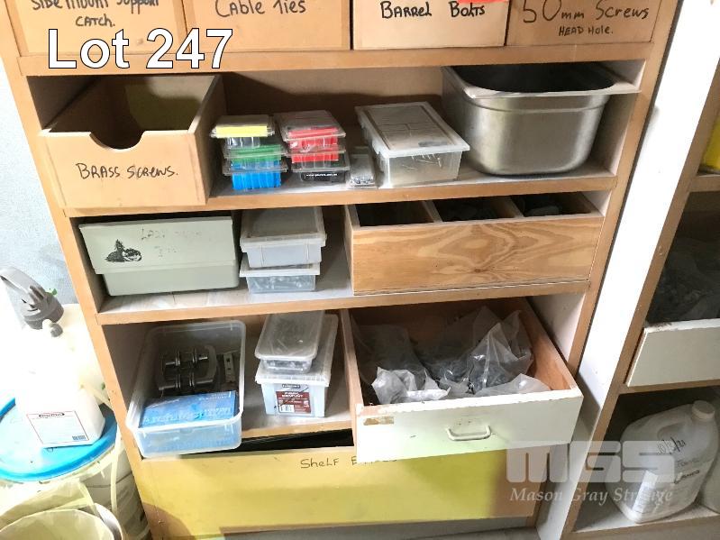 ASSORTED FASTENERS, BEAM SADDLES, BOLTS ETC (CONTENTS SHELF UNIT & DRAWERS)