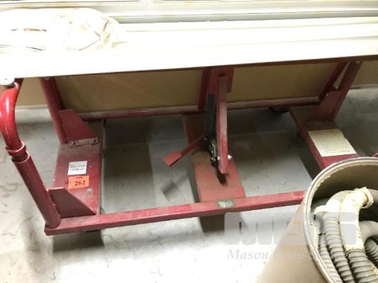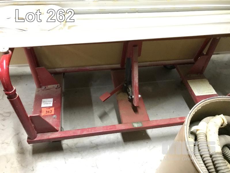 RED STEEL FRAMED 4 WHEEL TROLLEY WITH HYDRAULIC CENTRE LIFT