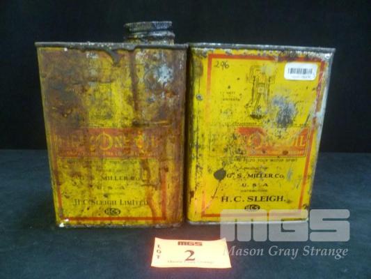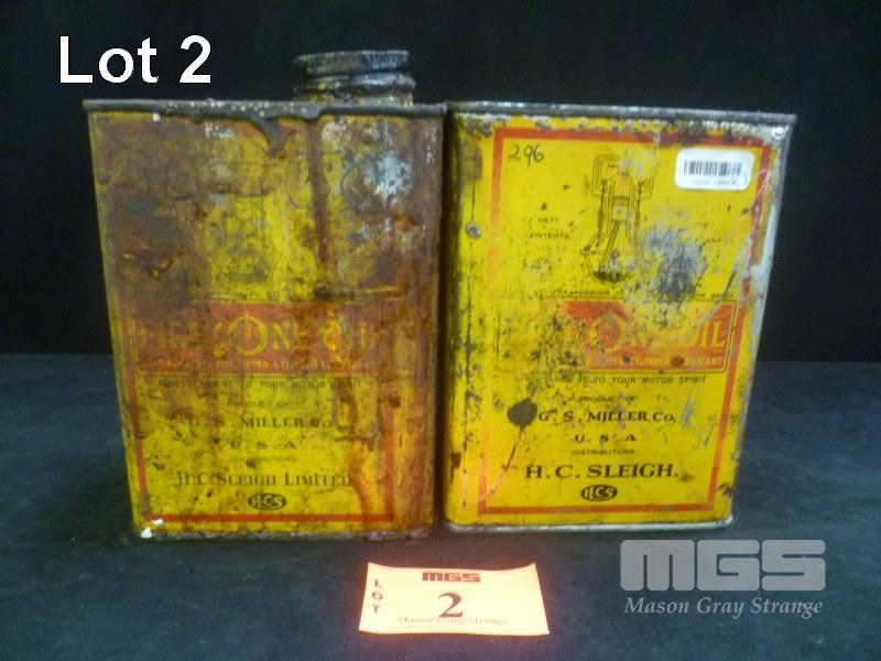 2 x FIREZONE OIL TINS, (HC SLEIGH) 1 QUART, ONE TIN TOP CUT OUT