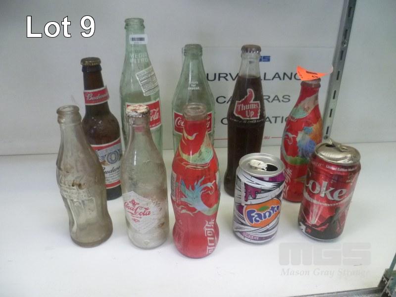 10 x COLLECTABLE COKE BOTTLES AND CANS INCLUDING BUD. BEER & FANTA CAN
