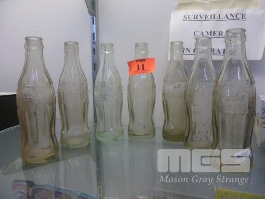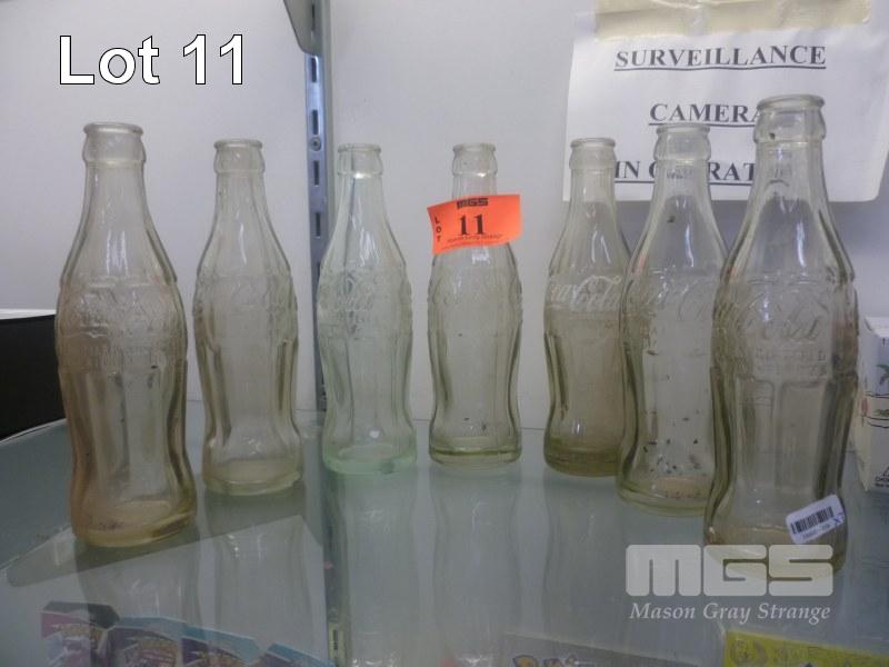 7 x VINTAGE COKE BOTTLES INC EMBOSSED & GREEN GLASS