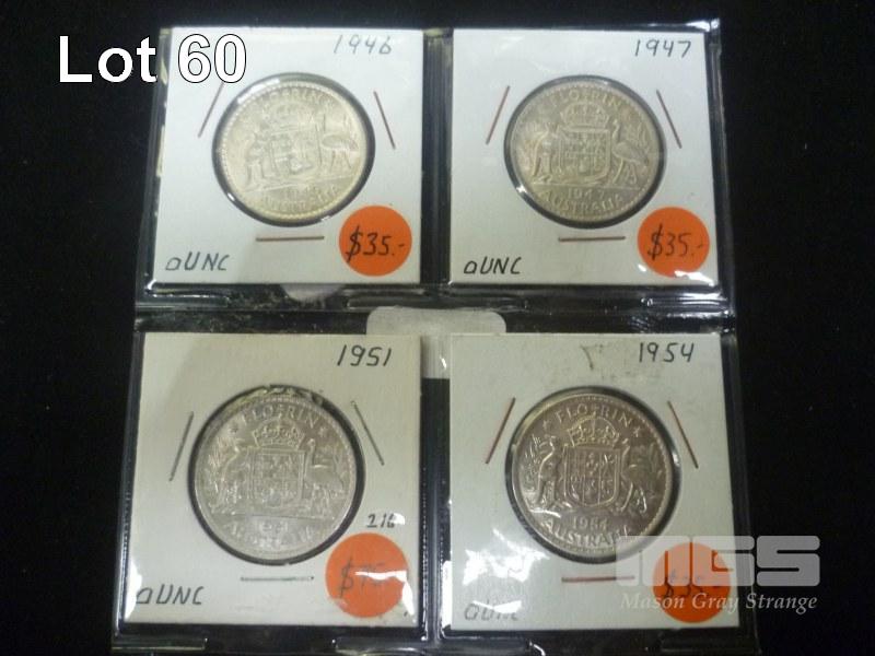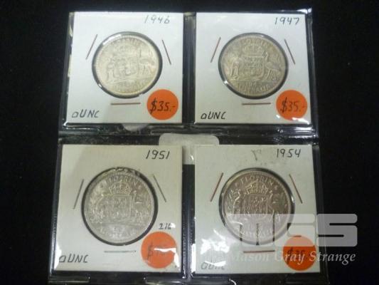 1946-47-51-54 AUSTRALIA FLORINS AUNC HIGH GRADE, 4 COINS