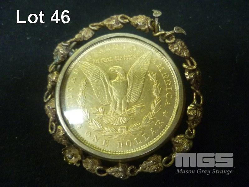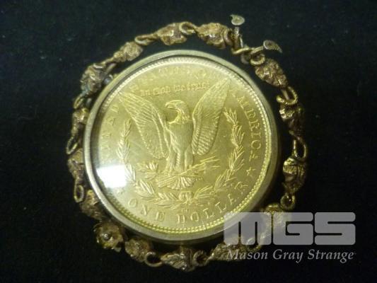 1879 USA ONE DOLLAR COIN SET IN GOLD PLATED GLASS ENCASED BROOCH (ALL FAULTS)