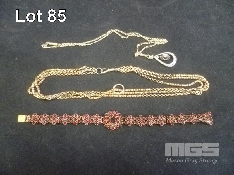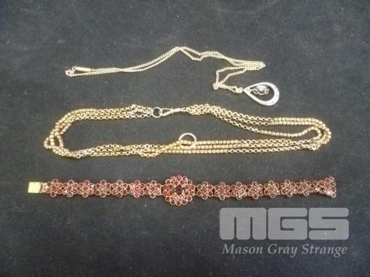 VINTAGE LADIES BRACLETTE, FLORAL DESIGN WITH MULTIPLE RED STONES, 2 X UNMARKED CHAINS & 1 X PENDANT
