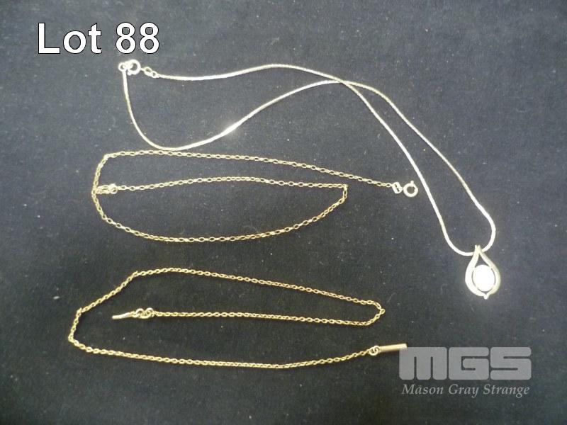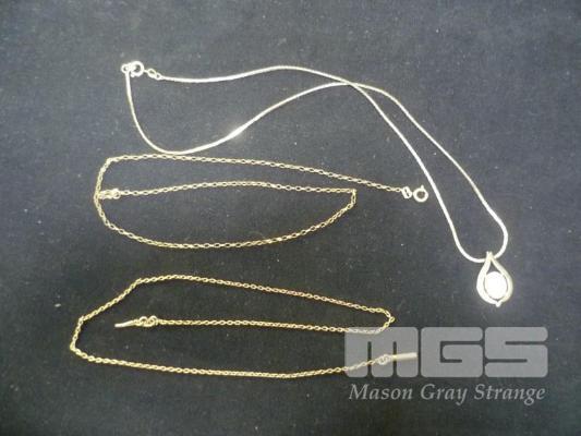 GOLD NECKLACE MARKED 375 WITH TEARDROP SHAPED PENDANT SET WITH OVAL OPAL STONE, TOTAL WEIGHT 4.4gms 2 X GOLD CHAINS, 1 X ROLLED GOLD, 1 X GOLD FILLED 3.2 gms TOTAL