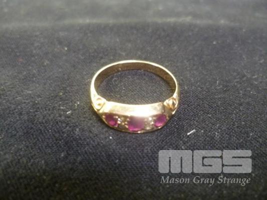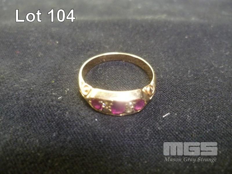 GOLD RUBY DIAMOND RING SET WITH 3 BAGUETTE RUBIES & DIAMOND CHIPS MARKED 18ct, 3.24 GRAMS