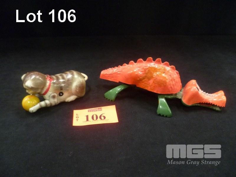 2 x TIN WIND UP TOYS INC TRI-ANG MINIC JABBERWOCK, MADE IN ENGLAND, (TAIL MISSING) & CAT WITH BALL MADE IN US-ZONE GERMANY