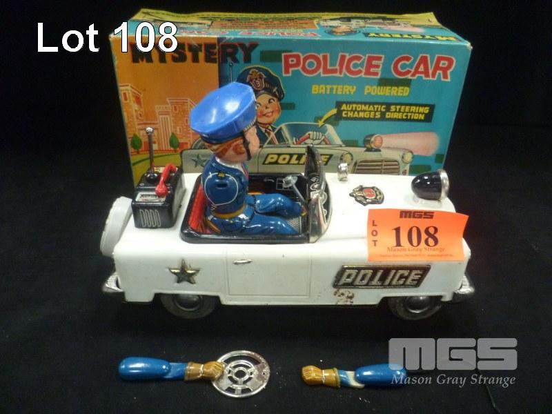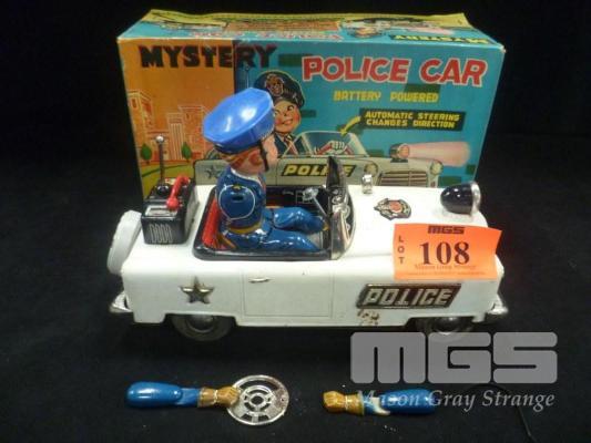 MYSTERY POLICE CAR, BATTERY POWERED, ALL FAULTS ARMS DETACHED, IN ORIGINAL BOX